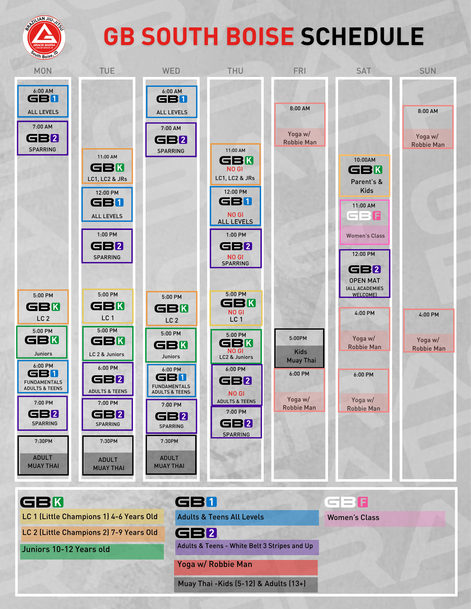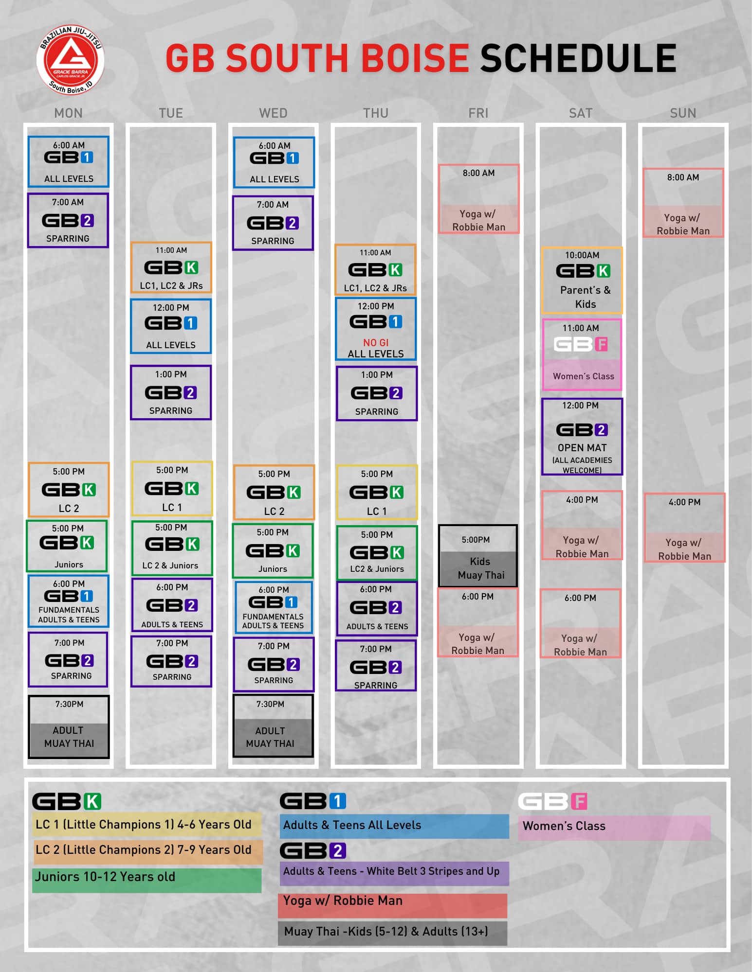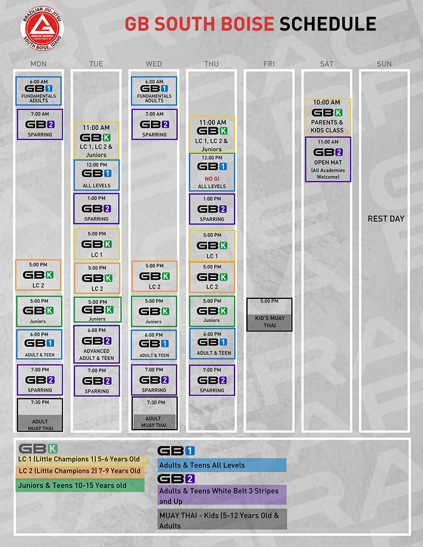 Gracie Barra SouthBoise's schedule is thoughtfully designed to offer flexibility and convenience,